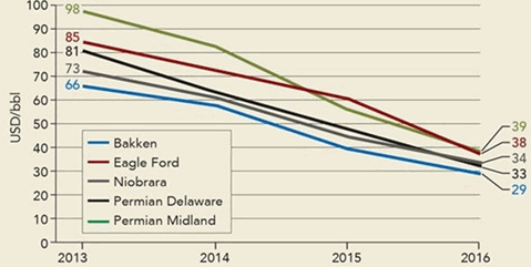В начале марта Rystad Energy выпустила отчет о том, какую роль повышение технологической эффективности сыграло в снижении себестоимости добычи сланцевой нефти, сопроводив его следующим графиком: