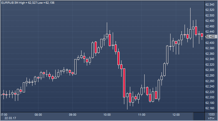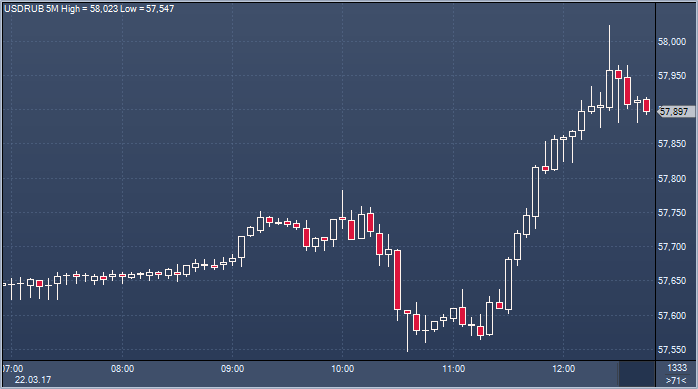 Таким образом, по официальному курсу ЦБ  доллар вырос к рублю на 40 копеек, а евро вырос к рублю на 53 копейки по сравнению с официальным курсом среды. Объем торгов на Московской бирже к 12:46 мск среды составил 989.2180 млрд рублей или 17 284.2604 млн долларов. Курс рубля открылся снижением, и после незначительной попытки изменить ситуацию к лучшему падение возобновилось и продолжается до настоящего момента. Рубль оказался заложником ухудшения настроения инвесторов на мировых рынках. Инвесторы посчитали, что президенту США Дональду Трампу будет сложно выполнить обещание о снижении налогов, обеспечивавшее рост рынка до рекордных максимумов в последние несколько месяцев. S&P 500 и Dow Jones Industrial Average показали худшие однодневные результаты после победы Трампа на ноябрьских выборах. Нефть снижается также и по причине роста запасов в США. Как сообщил вчера вечером после закрытия рынков в США Американский институт нефти (API), запасы нефти в США выросли на 4.5 миллиона баррелей до 533.6 миллиона за неделю, завершившуюся 17 марта, тогда как эксперты предсказывали рост на 2.8 миллиона баррелей. Данные Управления энергетической информации (EIA) выйдут сегодня в 17:30 мск.