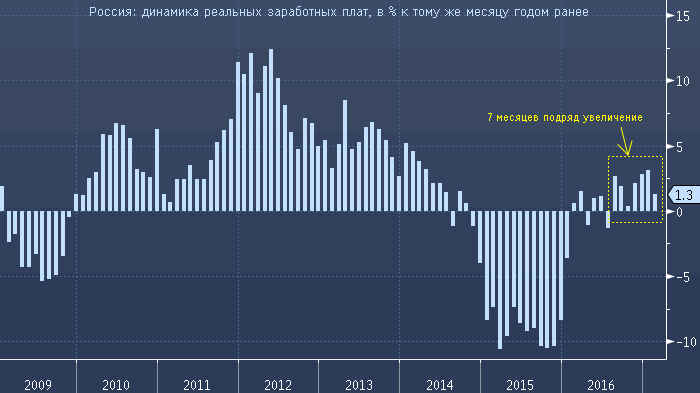 Представленные в этой статье диаграммы позволяют увидеть, что реальная заработная плата демонстрирует увеличение 7 месяцев подряд. Но это по стране. Это совсем не отражает реальную ситуацию с доходами малоимущих граждан. Если опираться на недавние комментарии главы департамента денежно-кредитной политики Банка России Игоря Дмитриева, доходы двух третей (!) наших граждан оказались ниже среднего месячного показателя по состоянию на 3 квартал 2016 года. Причем именно эта до неприличия большая доля населения является наиболее чувствительной к увеличению цен. Именно эта группа вносит наиболее весомый вклад в рост инфляционных ожиданий.