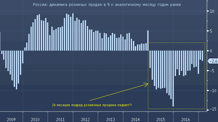 В результате мы получает вот такую официальную статистику за февраль: реальные зарплаты в целом по стране растут 7 месяцев подряд при резком снижении реального располагаемого дохода и падении розничных продаж, вдумайтесь, 26 месяцев подряд. Даже если искать оправдание в том, что прошлый год был високосным, и февраль 2016 года имел на 2 рабочих дня больше, все равно процентное ухудшение до неприличия негативно.