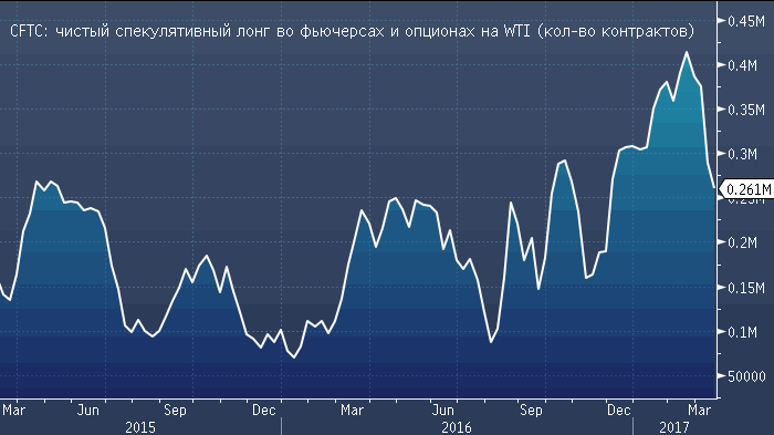 Как следует из опубликованных только что данных CFTC, за неделю до 21 марта объем чистой длинной спекулятивной позиции во фьючерсах и опционах на нефть WTI (опять) сократился на 28 197 контрактов до 260 577 контрактов (минимальное значение за последние 16 недель). Кроме того: