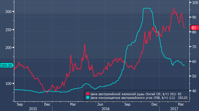 Цены на уголь уже сдали большую часть позиций, занятых в ходе ралли с августа по ноябрь 2016, и в Barclays полагают, что столь же неустойчив и рост цен на железную руду — стратеги банка полагают, что с текущих $83 за тонну цена во втором полугодии упадет к уровням вблизи $55.