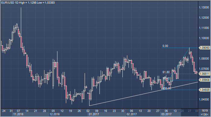 В понедельник настрой в отношении евро/доллара не претерпел существенных изменений: прошлая неделя завершилась формированием медвежьего поглощения, пару все также продают при попытках роста, и она тяжело опирается на биды поблизости от 1.0650/40, где проходит 61.8% от роста с начала месяца. Для улучшения тона торгов евро необходимо закрепиться выше седьмой фигуры, а пока краткосрочные риски остаются смещены в пользу медведей, и прорыв ниже 1.0640 обещает придать импульс для снижения в направлении линии поддержки с 3 января в районе 1.0575. Офера остаются вблизи 1.0680 и в районе фигуры, хороший интерес к продаже отмечен около 1.0720/30. Источник: ProFinance.Ru - Новости рынка Форекс