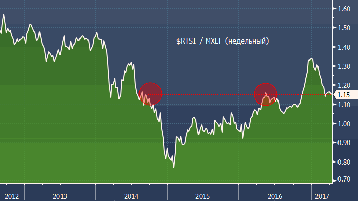 В последние месяцы российский фондовый рынок не пользуется особой популярностью у инвесторов, корректируясь вместе с нефтью после прошлогоднего роста. По данным Bloomberg, долларовый индекс РТС ($RTSI), в этом году возглавляющий список главных аутсайдеров развивающегося мира, достиг однолетнего минимума против его сводного фондового индекса (MXEF), что побудило некоторых экспертов рекомендовать к покупке подешевевшие акции российских компаний и российскую валюту.