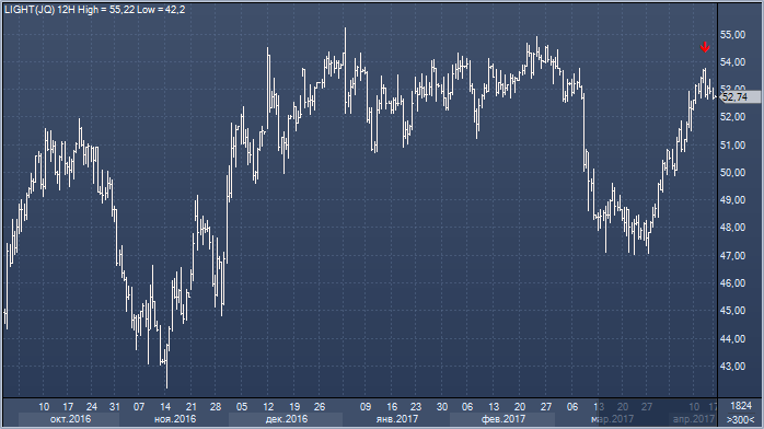 Как мы и предупреждали, по мере приближения майского фьючерса на WTI к отметке $54 запал быков заметно слабел (эта область является важным сопротивлением), и последние сессии черное золото провело, консолидируясь чуть ниже ее.