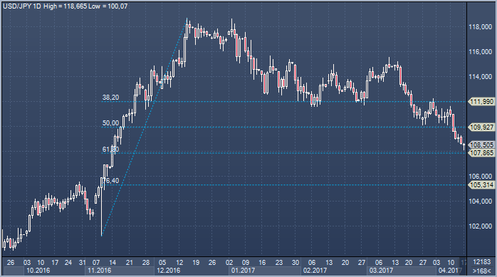 Снижение доллар/иены протекает неспешно, но весьма планомерно, и пока признаков изменения ситуации не наблюдается: попытки восстановления остаются вялыми, а техническая картина не дает намеков на формирование основания. Близость поддержки в районе 107.86 (61.8% от роста с 09/11/16) в текущих условиях не выглядит достаточно веским основанием для активной фиксации прибыли — общий характер технической картины остается медвежьим, при этом в пятницу пара сформировала закрытие ниже 200-дневной скользящей средней, а ослабления нисходящего импульса пока не заметно.