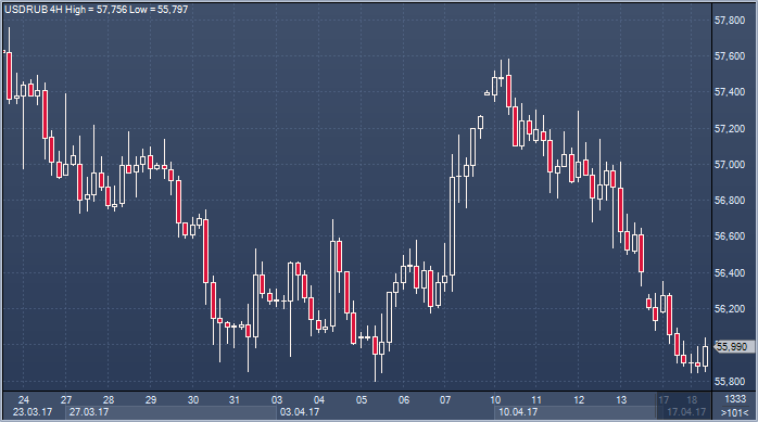 Рубль во вторник продолжает тестировать почти двухлетние максимумы, сегодня ему не хватило утром 5 копеек. Торги на "Московской бирже" во вторник утром открылись осторожным ростом рубля к бивалютной корзине на фоне отсутствия изменений на рынке нефти. Первые сделки по доллару США прошли на "Московской бирже" в диапазоне 55.93-56.06 рубля за доллар, а сейчас курс составил 55.95. Евро торгуется без изменений на уровне 59.59 рубля за евро. Рост рубля обязан некоторой разрядке в отношениях Москвы и Запада, переключения фокуса на Северную Корею, в конфликте с которой также наступила пауза, что спровоцировало отскок цен на рискованные активы, в частности, акции. Однако корейская ситуация далека от разрешения и будет держать рынки в напряжении. Другим поводом не покупать высокодоходные, но рискованные, активы являются предстоящие президентские выборы во Франции. Сегодня европейские трейдеры возвращаются на рынки после Пасхи. Другим поводом укрепления рубля является налоговый период. Третьим — технический: рубль тестирует максимумы почти за два года, выше которых могут быть выставлены стоп-лоссы.