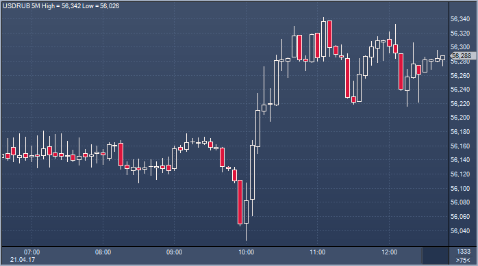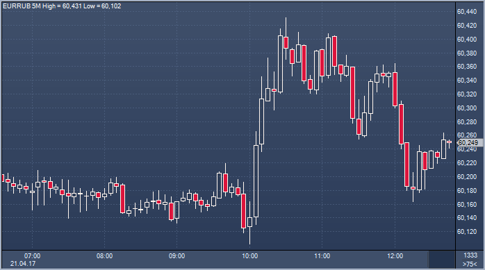 Таким образом, по официальному курсу ЦБ доллар упал к рублю на 18 копеек, а евро упал к рублю на 30 копеек по сравнению с официальным курсом пятницы. Объем торгов на Московской бирже к 12:45 мск пятницы составил 979.6800 млрд рублей или 17 365.1321 млн долларов. Курс рубля открылся ростом к доллару и евро, после чего ушел в минус, а теперь торгуется в районе уровней закрытия четверга. Игроки закрывают позиции перед выборами во Франции. Если шансы Марин Ле Пен на то, чтобы занять пост президента Франции, увеличатся по итогам первого тура на 10 п.п., EUR/USD может упасть ~ 2%, считают стратеги Goldman Sachs. В этом случае рубль пострадает, поскольку относится к классу рисковых активов. В понедельник торги могут открыться с гэпом.