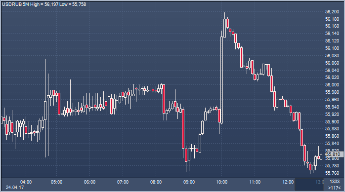 Таким образом, по официальному курсу ЦБ доллар упал к рублю на 16 копеек, а евро вырос к рублю на 53 копеки по сравнению с официальным курсом субботы. Объем торгов на Московской бирже к 13:00 мск понедельника составил 970.2545 млрд рублей или 17 254.8900 млн долларов. Курс рубля открылся ростом к доллару и падением к евро после обьявления итогов первого тура выборов во Франции, где во второй тур вышли Эммануэль Макрон и Марин Ле Пен. Поскольку соцопросы показывают, что Ле Пен проиграет во втором туре, рынки отыгрывают уже сейчас тот факт, что следующим главой Франции будет именно Макрон, выступающий за единство Европы.