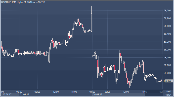 Результаты 1 тура французских президентских выборов оказали благотворное влияние на отношение инвесторов к риску по всему миру. Эммануэль Макрон лидирует по результатам первого тура и опережает Марин Ле Пен. Консолидированное экспертное мнение видит в этом гарантию победы Макрона во 2 туре, который состоится 7 мая. Аппетит к риску не обошел стороной и российские активы. Это оказало поддержку рублю на торгах в понедельник, ровно, как и текущая активная фаза апрельского налогового периода. Это позволило курсу закрепиться ниже 56 рублей за доллар, даже несмотря на наблюдаемое в понедельник снижение нефтяных котировок (онлайн график Brent можно посмотреть здесь).