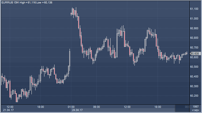 По итогам торгов в понедельник 24 апреля курс доллара к рублю упал на 65 копеек и составил 55.80 за единицу американской валюты. Курс евро незначительно вырос на 7 копеек до 60.64 рубля за единицу европейской валюты (прим. ProFinance.ru: по состоянию на 23:50 мск).