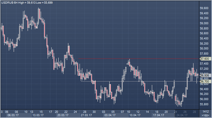 Вместе с тем, рубль утратил поддержку в виде спроса в рамках налоговых платежей, а динамика USDRUB с технической точки зрения предполагает некоторый рост рисков развития коррекционной фазы — в конце концов, фиксация прибыли после затяжного роста выглядит вполне нормальным явлением и не означает окончание тенденции. Курс доллара к рублю продолжает движение все в том же диапазоне, что и пару недель назад, и основные технические уровни остаются прежними, в частности преградой на пути к развитию восстановления все так же является сопротивление вблизи 57.60. Попытки проверить его на прочность пока встречают отпор, но USDRUB остается выше «пограничной зоны» в 56.70, и пока фокус остается смещен к верхней границе диапазона, при этом подавленный настрой на рынке нефти выполняет роль моральной поддержки для медведей по российской валюте (корреляция между рублем и ценами на нефть в последнее время низкая).  Источник: ProFinance.Ru - Новости рынка Форекс