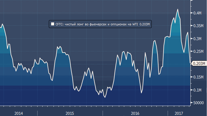 Как следует из последних данных CFTC, за неделю до 2 мая объем чистой длинной спекулятивной позиции во фьючерсах и опционах на нефть WTI сократился на 52 317 контрактов до 203 104 контрактов (минимальное значение за последние 5 месяцев). Кроме того: