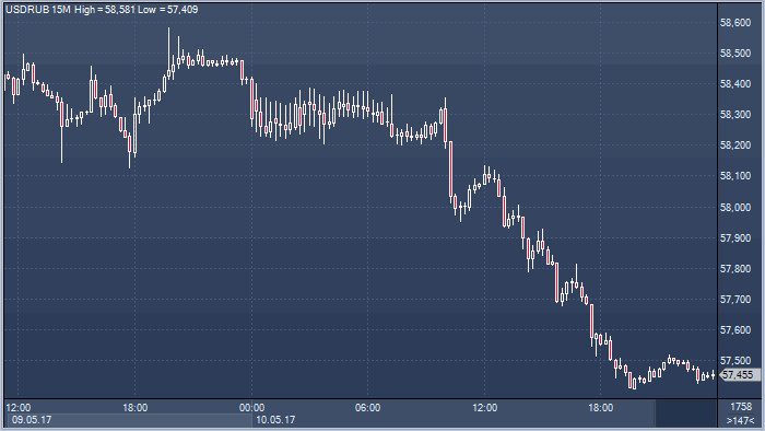 По итогам торгов в среду 10 мая курс доллара к рублю упал на 48 копеек и составил 57.45 за единицу американской валюты. Курс евро снизился на 129 копеек до 62.43 рубля за единицу европейской валюты (прим. ProFinance.ru: по состоянию на 23:50 мск).