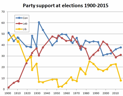 На представленном ниже графике представлены данные о голосах (в процентах), полученными на общих выборах в Великобритании партиями - Консервативной (синий), Лейбористской (коричневый) и Либеральными демократами (желтый). Источник: ProFinance.Ru - Новости рынка Форекс