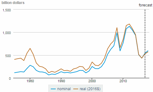 Как следует из опубликованного сегодня отчета подразделения Минэнерго США (EIA), в 2016 году выручка членов ОПЕК от экспорта нефти составила $433 млрд (минимальное значение с 2004 года, см. рисунок внизу), что на 15% меньше $509 млрд, полученных годом ранее (ProFinance.ru: что все равно не дотягивает до «напечатанного» одним только Банком Японии за тот же период). Кроме того, эти цифры включают и Иран, который был исключен из расчетов EIA в 2012-2015 годах, а на долю Саудовской Аравии пришлись $133 млрд из $433 млрд.