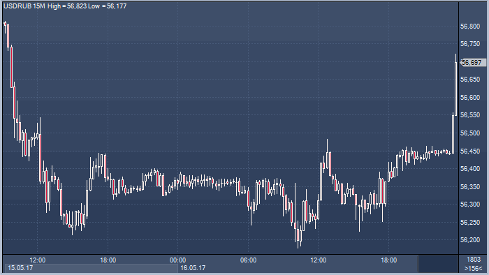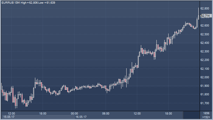 По итогам торгов во вторник 16 мая курс доллара к рублю вырос на 21 копейку и составил 56.58 за единицу американской валюты. Курс евро снизился на 85 копеек до 62.71 рубля за единицу европейской валюты (прим. ProFinance.ru: по состоянию на 23:50 мск). Столь заметное снижение российской валюты против евро связано со значительным укреплением позиций евро на международном валютном рынке.