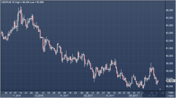 После того, как президент РФ Владимир Путин упомянул возможность снижения курса рубля с помощью «рыночных механизмов», в конце апреля Банк России неожиданно понизил ставку сразу на 50 б.п. (нынешний уровень составляет 9.25% годовых). Однако незадолго до этого глава регулятора Эльвира Набиуллина заявила о том, что впредь смягчение денежно-кредитной политики будет осторожным. Данные по потребительской инфляции за апрель поддерживают недавний шаг ЦБР, при этом темпы роста цен продолжают приближаться к его цели на уровне 4%. На этом фоне курс рубля остается в диапазоне 56–57 рублей за доллар, и восстановление цен на нефть в последние дни поддерживает рубль.