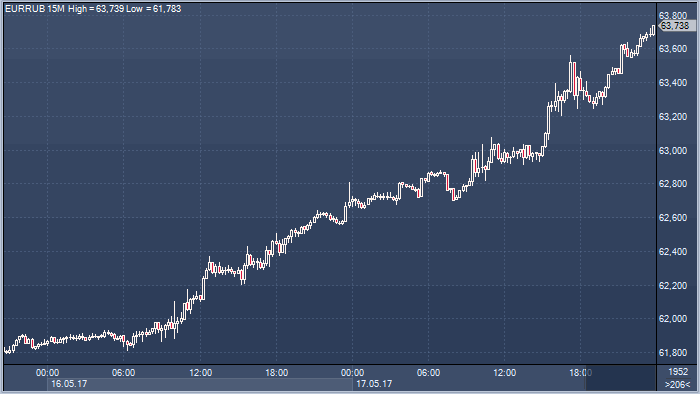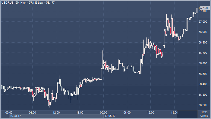По итогам торгов в среду 17 мая курс доллара к рублю вырос на 53 копейки и составил 57,11 за единицу американской валюты. Курс евро подскочил на 101 копейку до 63.72 рубля за единицу европейской валюты (прим. ProFinance.ru: по состоянию на 23:50 мск). Столь заметное снижение рубля против евро отражает заметный рост единой валюты на международном валютном рынке против американского конкурента.