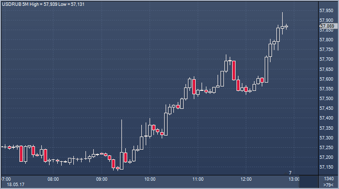 Таким образом, по официальному курсу ЦБ доллар вырос к рублю на 73 копейки, а евро вырос к рублю на рубль и 4 копейки по сравнению с официальным курсом четверга. Объем торгов на Московской бирже к 12:49 мск четверга составил 787.3027 млрд рублей или 13 876.0354 млн долларов. Курс рубля продолжает падение в среду из-за угрозы новых санкций против России в случае Трампгейта. Опасения того, что президенту Трампу в конечном итоге может грозить импичмент, подрывает спрос на рисковые активы и повышает его на безрисковые (трежерис, бундесы, иена, франк, серебро, золото и прочее). Наиболее сильно могут пострадать именно российские активы, так как в случае импичмента его причинами станут связи Трампа с Россией, а значит Москве грозят новые санкции. Министерство юстиции США поручило бывшему руководителю ФБР расследовать возможные связи предвыборного штаба Дональда Трампа и России. Назначение специального советника последовало за увольнением с поста главы ФБР Джеймса Коми, который занимался "российским следом" в американских выборах. Thе Wall Street Journal узнала о том, что российский Внешэкономбанк (ВЭБ) мог финансировать строительство отеля Trump Organisation в Торонто. По данным издания, сейчас следствие в США включило эти сведения в дело о возможных связях Трампа с Россией. По данным газеты, строительством 65-этажного отеля International Hotel and Tower занимался выходец из России Александр Шнайдер. Подконтрольная ему Midland Resources Holding Ltd. Могла инвестировать средства в проект после продажи им своей доли в «Запорожстали» в 2010 году. Тогда имя покупателя не указывалось. Сумма сделки, по информации S&P Global Market Intelligence, составила $850 млн.