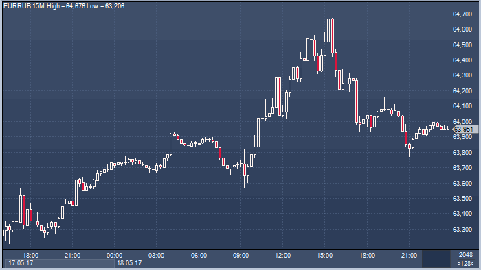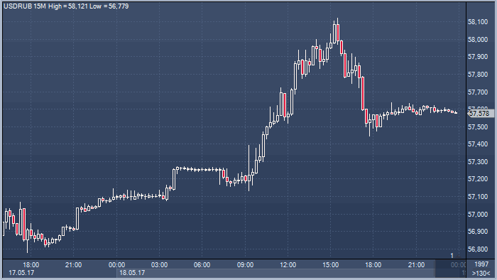 По итогам торгов в четверг 18 мая курс доллара к рублю вырос на 47 копеек и составил 57.58 за единицу американской валюты. Курс евро укрепился на 23 копейки до 63.95 рубля за единицу европейской валюты (прим. ProFinance.ru: по состоянию на 23:50 мск).