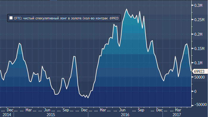 Согласно последним данным американской Комиссии по торговле товарными фьючерсами (CFTC), за неделю до 16 мая крупные спекулянты сократили объем чистой длинной позиции во фьючерсах и опционах на золото на 29 997 контрактов до 69 923 контрактов (8-недельный минимум). Кроме того: