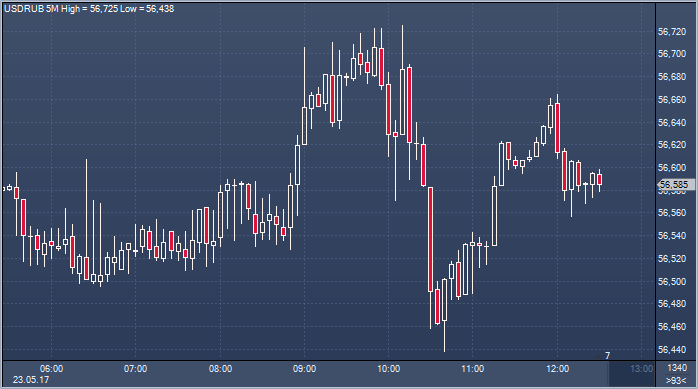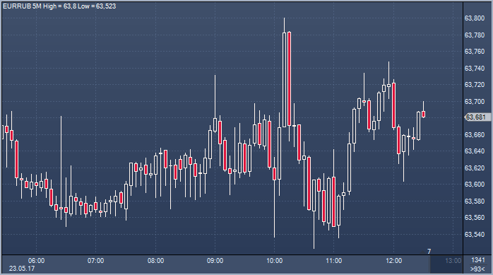 Таким образом, по официальному курсу ЦБ доллар вырос к рублю на 6 копеек, а евро вырос к рублю на 44 копейки по сравнению с официальным курсом вторника. Объем торгов на Московской бирже к 12:31 мск вторника составил 694.6007 млрд рублей или 12 294.0789 млн долларов. Курс рубля сегодня ощущает поддержку экспортеров и не падает вопреки снижению цен на нефть. Оптимизм, обусловленный ожиданием того, что страны ОПЕК+договорятся не только о продлении соглашения об ограничении нефтедобычи на саммите 25 мая, но также и о дополнительном объеме сокращения производства, стал самостоятельным фактором поддержки российской валюты. Вероятно, до четверга, когда картель примет решение, рубль останется в узком диапазоне. Евро растет к рублю на фоне сильного роста евро/доллара после словесной интервенции Ангелы Меркель.
