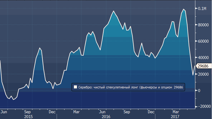 Согласно последним данным американской Комиссии по торговле товарными фьючерсами (CFTC), за неделю до 23 мая крупные спекулянты увеличили объем чистой длинной позиции во фьючерсах и опционах на серебро на 11 388 контрактов до 29 686 контрактов.