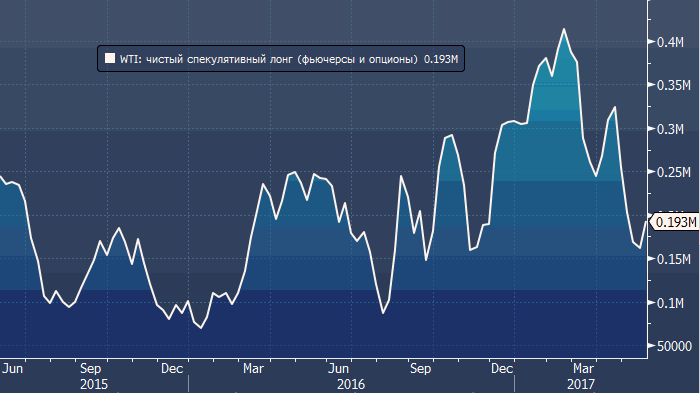 Согласно последним данным американской Комиссии по торговле товарными фьючерсами (CFTC), за неделю до 23 мая крупные спекулянты увеличили объем чистой длинной позиции во фьючерсах и опционах на нефть WTI на 31 849 контрактов до 193 143 контрактов (3-недельный максимум).
