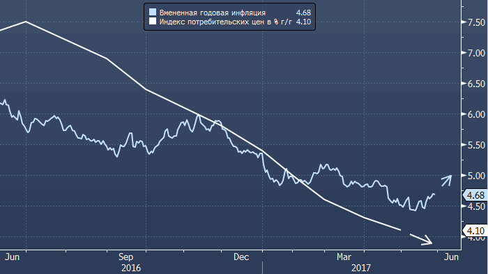 В контексте текущей ситуации с «недобором спроса» на ОФЗ все более привлекательной выглядит стратегия экспертов Райффайзен Капитал, которые не верят заверениям Банка России и считают, что инфляция в районе 4% это кратковременное явление. В текущей ситуации стоит присмотреться к возможности купить «линкеры» (прим. ProFinance.ru: облигации с привязкой к инфляции). Причем, чем вмененная инфляция сейчас будет становиться ниже, тем более привлекательны к покупке становится данный вид долговых бумаг.