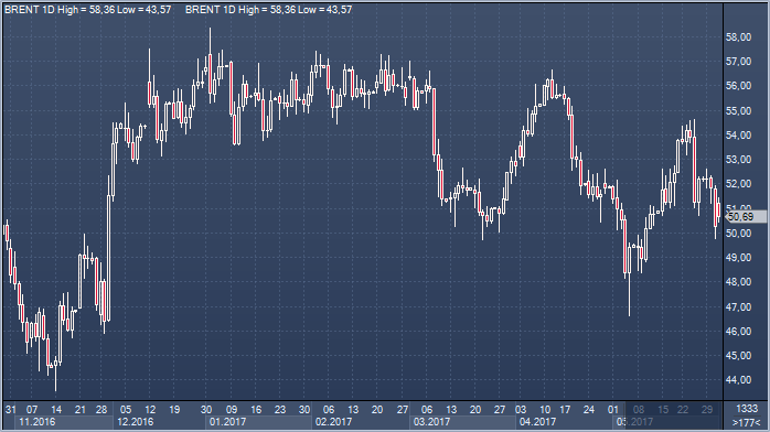 За последний месяц котировки Brent и WTI восстановились с годовых минимумов $46.64 и $45.52 за баррель соответственно, однако они так и не смогли вернуться к апрельским максимумам. Обещанное перед саммитом ОПЕК продление соглашения о сокращении добычи подтолкнуло котировки обеих марок к максимумам $54.67 и $52 за баррель соответственно. Однако когда соглашение было заключено, цены на нефть консолидировались, упав на $3 по сравнению с уровнями, наблюдавшимися накануне саммита. В конечном итоге пролонгация сделки до конца марта 2018 года всего лишь подтолкнула рынок ближе к середине диапазона $43.76-$58.37 за баррель.