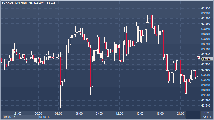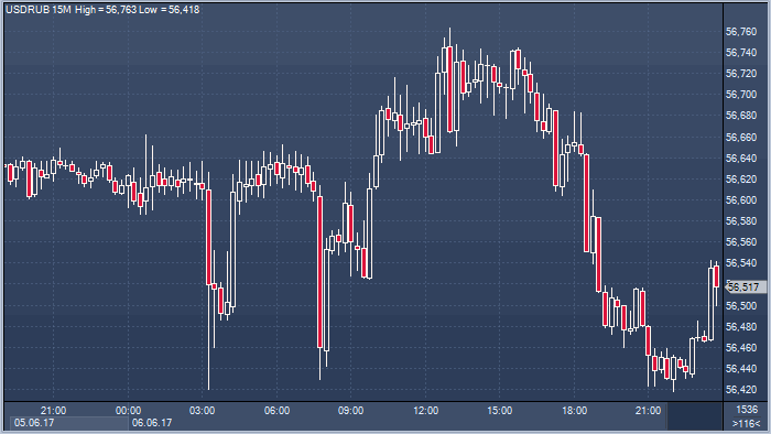 По итогам торгов во вторник 6 июня курс доллара к рублю снизился на 9 копеек и составил 56.51 за единицу американской валюты. Курс евро символически вырос на 3 копейки до 63.73 рубля за единицу европейской валюты (прим. ProFinance.ru: по состоянию на 23:50 мск).