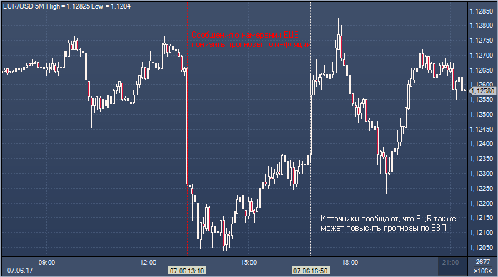Участники валютного рынка находятся в некотором замешательстве: после сообщений о намерении ЕЦБ понизить прогнозы по инфляции трейдеры решили было сократить длинные позиции в евро, открытые в последнее время, однако затем в СМИ появились сообщения со ссылкой на источники в центробанке о том, что ЕЦБ также может повысить прогнозы по темпам роста экономики. В итоге, евро потоптался у двенадцатой фигуры и рванул выше, предприняв новую попытку штурма сопротивления в районе 1.1285, которая, впрочем, вновь оказалась неудачной. Евро пока остается в рамках устоявшегося в последние дни диапазона, но порывистость движений сигнализирует о возросшей нервозности, и реакция на сигналы со стороны ЕЦБ, которые поступят завтра, может оказаться бурной. Направление движения во многом будут зависеть от того, подтвердятся ли утечки информации относительно масштабов снижения прогнозов по инфляции, как сильно будет повышена оценка перспектив роста ВВП, и найдет ли рынок подтверждение ожиданий нормализации политики ЕЦБ в риторике Марио Драги. Источник: ProFinance.Ru - Новости рынка Форекс
