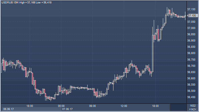 По итогам торгов в среду 7 июня курс доллара к рублю вырос на 57 копеек и составил 57.09 за единицу американской валюты. Курс евро увеличился на 51 копейку до 64.29 рубля за единицу европейской валюты (прим. ProFinance.ru: по состоянию на 23:50 мск).