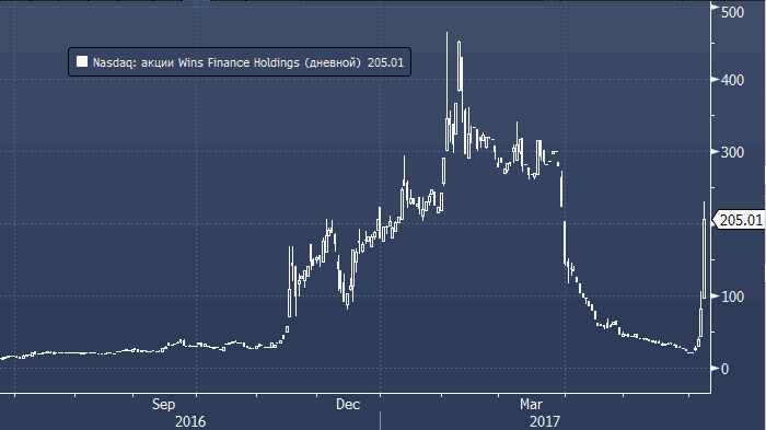 Несколько месяцев назад акции небольшой финансовой китайской компании Wins Finance Holdings (выступает гарантом по кредитам, торгуется на Nasdaq и входит в Russell 2000) выросли на 4 500%, затем об этих удивительных событиях сообщило агентство Bloomberg, и бумаги подешевели в 20 раз. Но это не конец истории, так как в последние дни они взлетели на 1 000%, и никто не знает почему (в прошлый четверг капитализация компании составляла $400 млн, а вчера — уже $4 млрд).