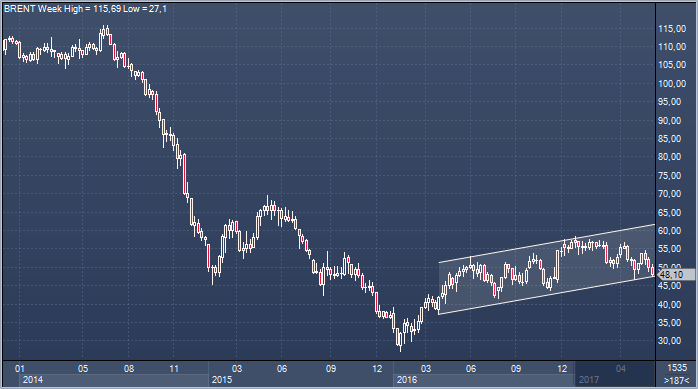 Нефть, обновив минимумы в районе $47.56, вернулась выше $48 за баррель, однако настрой не претерпел существенного улучшения, и попытки восстановления продолжают привлекать продавцов. Близость нижней границы канала ($47.48) может стать оправданием для некоторой фиксации прибыли по коротким позициям, но участники рынка остаются под впечатлением от опубликованного вчера отчета по запасам в США, что вкупе с негативными изменениями в технической картине предполагает рост риска развития нисходящей динамики в направлении минимумов мая и 38.2% от роста с 2016 в области $46.64/$46.42.