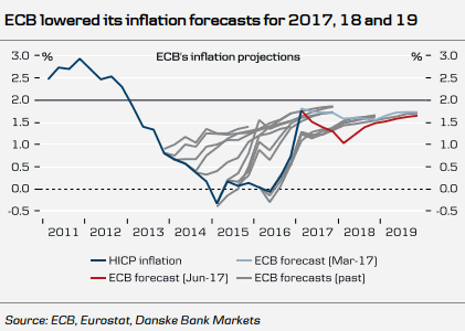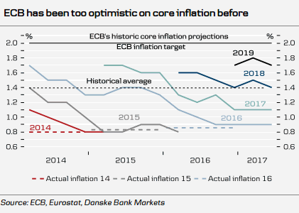 Валютные стратеги Danske Bank отмечают, что сигналы со стороны ЕЦБ, поступившие сегодня, были чуть менее мягкими, нежели раньше, однако изменение риторики не устроило быков по евро. Показатели экономического роста улучшились, но рынок упускал ряд факторов, которые являются сдерживающими для ЕЦБ, и события двух последних дней несколько охладили появившиеся надежды на прояснение перспектив сокращения стимулирующих мер и нормализации ставок. Обсуждать эти вопросы пока действительно преждевременно, учитывая, что рост занятости до сих пор концентрировался в отраслях, где используются низкоквалифицированные кадры, а многие рабочие места предполагают неполный рабочий день, что предполагает риски для роста инфляции. ЕЦБ, понизив прогнозы по росту потребительской инфляции на фоне динамики цен на нефть, также понизил и оценку перспектив базового индекса цен потребителей, но, как считают в Danske Bank, и обновленные прогнозы могут не сбыться - история показывает, что ЕЦБ склонен к излишнему оптимизму в этом вопросе (см графики ниже*).