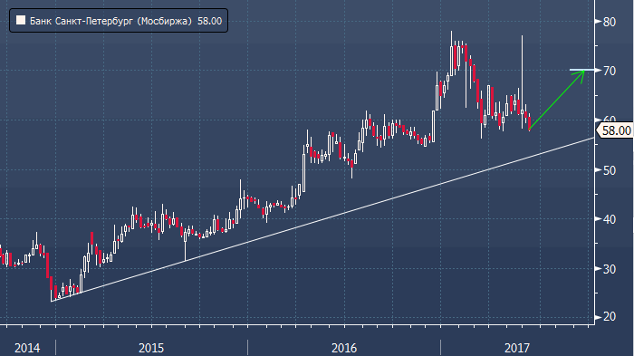 Аналитики ВТБ Капитал повысили рекомендацию по акциям Банка Санкт-Петербург до уровня «покупать». Предыдущая рекомендация была установлена на уровне «держать». Целевой уровень установлен на 70 рублях за акцию, что предполагает потенциал роста 20.7% относительно цены вечерашнего закрытия. За исключением данной рекомендации 5 экспертов по данной бумаги на вчерашний день имели рекомендацию «покупать», 3 эксперта - «держать» и 1 эксперт - «продавать».