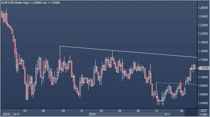 Евро начал новую неделю с попыток вернуться выше 1.1200, при этом паре удалось избежать прорыва локальных уровней поддержки, и в целом картина сохраняет достаточно конструктивный для быков характер. Аналитики Societe Generale, между тем, отмечают, что и небольшая коррекция паре отнюдь не повредит, учитывая потенциал, который предполагает сформированная на недельном графике модель перевернутая голова и плечи. Ее линия шеи проходит в районе 1.0860/1.0800, где также пролегают важные технические уровни, и, в то время как ближайшей целью для EURUSD остается верхняя граница канала около 1.1460 (также максимальные уровни закрытия 2015/2016 и 23.6% от снижения с 2011), в перспективе можно ожидать роста курса к 1.1685/1.1714 (максимумы августа 2015 и 23.6% нисходящего тренда с 2008). Ключевой же целью и препятствием для быков будет область 1.1875/1.2043.