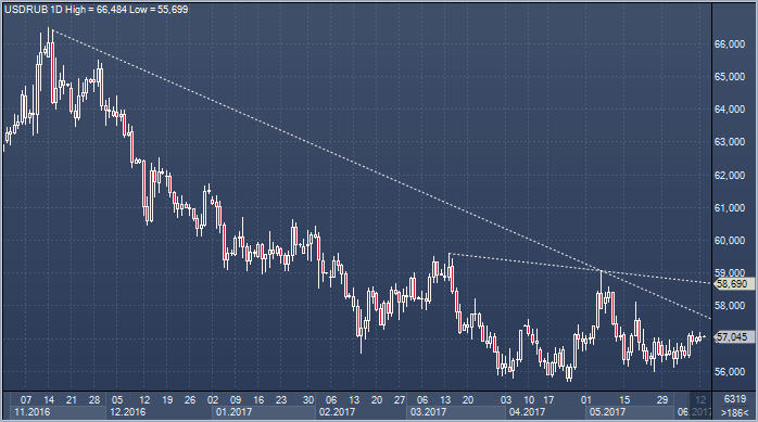 Радость от формирования перевернутой головы и плеч была недолгой - нефти так и не удалось закрепиться выше $49, и в настоящее время "черное золото" держится около $48.22, продолжая торговаться с подавленным настроем. Это не добавляет оптимизма быкам по рублю - российская валюта в последнее время демонстрировала чудеса стойкости, но свежих драйверов для роста не наблюдается, а терпение быков не безгранично. Некоторые из них, между тем, предпочитают заблаговременно сократить экспозицию в ожидании заседания Банка России, которое пройдет в эту пятницу. Краткосрочные риски смещены в пользу некоторой коррекции рубля, масштабы которой во многом будут зависеть от решения и риторики центробанка.