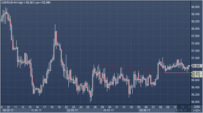Курс рубля завершил торги во вторник ростом, однако под конец дня быки чуть было не растеряли все занятые позиции - цены на нефть резко пошли вниз после публикации данных API по запасам. Вместе с тем, стоит отметить, что хотя российская валюта пыталась расти, техническая картина не претерпела значимых изменений: неудачная попытка пробиться выше 57.20/30 обернулась коррекцией USDRUB, но поддержка в районе 56.80 выдержала, и баланс рисков остается смещен в пользу некоторого восстановления пары.