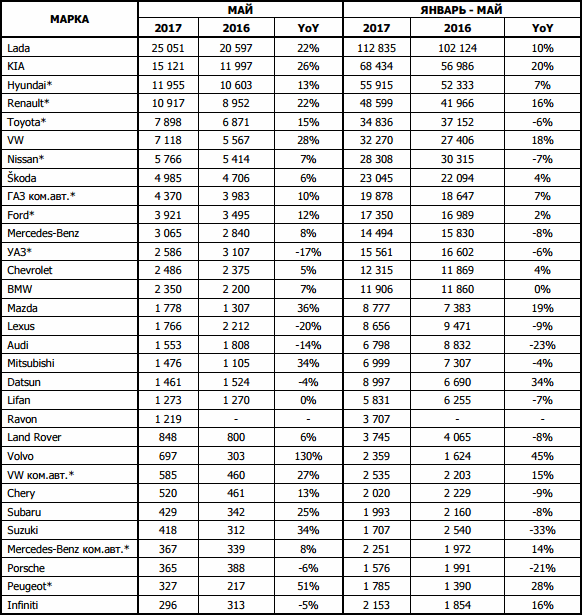 Согласно данным Ассоциации европейского бизнеса, в России продажи новых легковых и легких коммерческих автомобилей в мае 2017 года резко выросли к маю 2016 года на 14.7% (15 991 единиц) и составили 124 990 штук. С начала 2017 года было продано 577 449 автомобилей. Если мартовский прирост перекрыл негативную динамику января и февраля и вывел 1 квартал в небольшой плюс, то апрель и май продолжили этот позитивный задел. Позитивная динамика наблюдается у большинства игроков на рынке, отмечает председатель Комитета автопроизводителей Йорг Шрайбер.