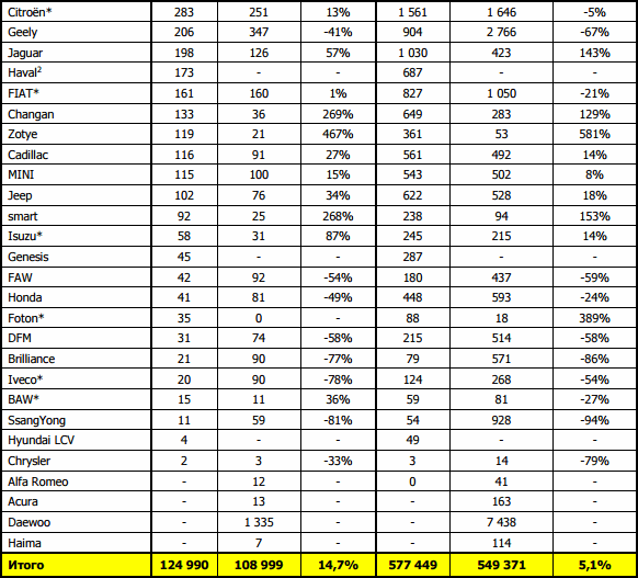 Продажи новых легковых и легких коммерческих автомобилей в России по маркам авто. Данные включают как импортированные, так и автомобили отечественной сборки. Сортировка в таблице по результатам продаж за месяц.