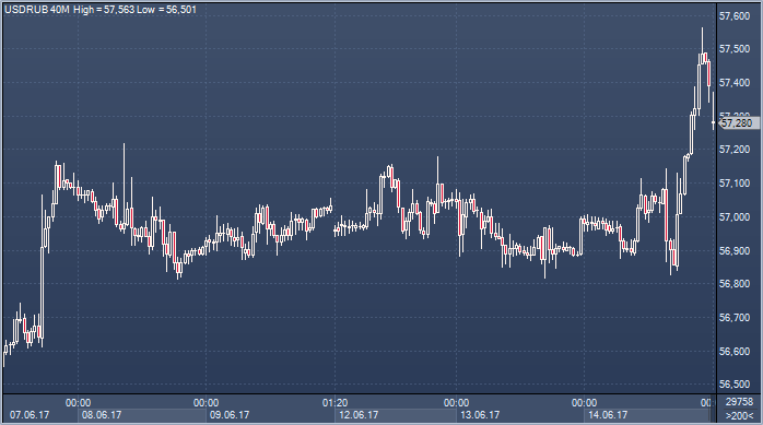 Курс доллара к рублю по итогам торгов в среду 14 июня вырос на 40 копеек до 57.39 рубля, курс евро к рублю прибавил 51 копейку и завершил день на отметке в 64.38 рубля.