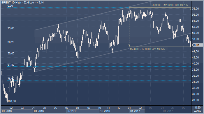 Масштабы падения цен на нефть для анализа ситуации все чаще заставляют обращаться к изучению графика дневного периода (см. ниже). Как видно, от максимумов 2017 года котировки Brent снизились более чем на 22%, пробили нижнюю линию восходящего канала и теперь картина на графике является медвежьей, а пресловутый уровень 50 долларов за баррель в данный момент выступает сильным сопротивлением, а не непреодолимой поддержкой, как это представлялось, когда ОПЕК (30 ноября) и ее союзники (11 декабря) заключили соглашение об ограничении объемов производства на 1.76 млн. баррелей в день по сравнению с уровнями октября 2016 года.