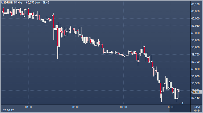 Таким образом, по официальному курсу ЦБ доллар упал к рублю на 49 копеек, а евро упал к рублю на 47 копеек по сравнению с официальным курсом пятницы. Объем торгов на Московской бирже к 12:32 мск пятницы составил 799.0543 млрд рублей или 13 284.7580 млн долларов. Курс рубля сегодня растет в рамках коррекции, чему помогает стабильность в ценах на нефть и налоговый период в России. Ближайшие дни станут решающими для рубля. Психологическая поддержка в 60 рублей за доллар играет свою роль.