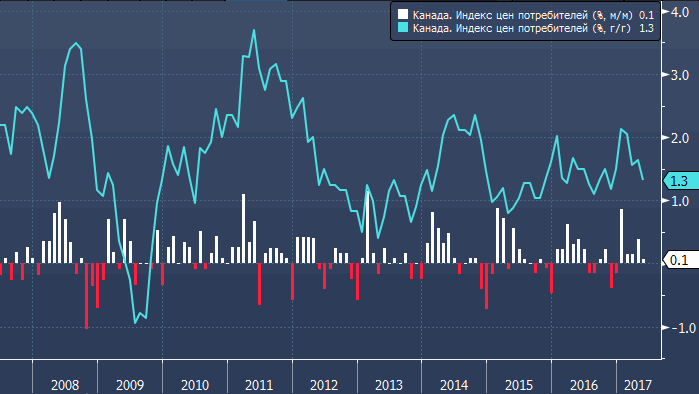 Канада. Индекс цен потребителей в мае +0.1% м/м до +1.3% г/г против прогноза +0.2% м/м до +1.5% г/г