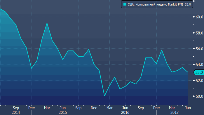 США. Композитный индекс PMI, июнь: 53.0 май: 53.6