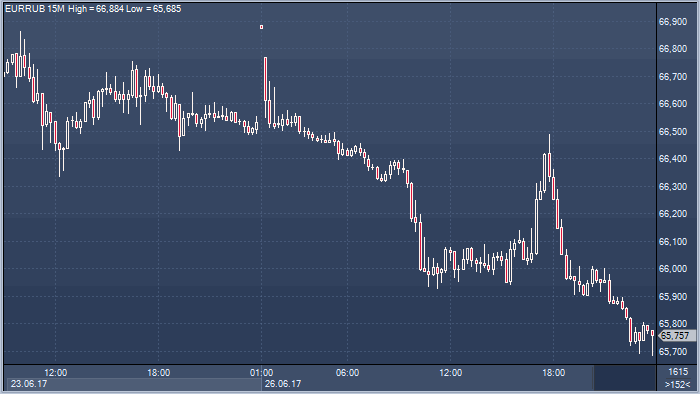 По итогам торгов в понедельник 26 июня курс доллара к рублю упал на 63 копейки и составил 58.75 за единицу американской валюты. Курс евро снизился на 78 копеек до 65.69 рубля за единицу европейской валюты (прим. ProFinance.ru: по состоянию на 23:50 мск).