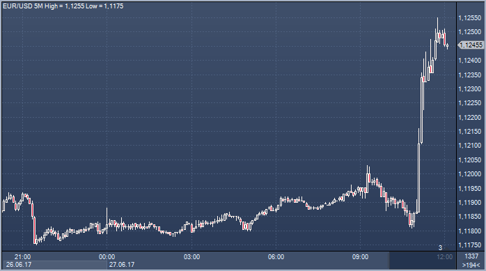 Курс евро резко подскочил вверх, пара EUR/USD расширяет прибыли, поднимаясь на 0.6% до 1.1250. Маржинальные имена превалируют среди покупателей, активизировавшись на прорыве 1.1200, говорит европейский дилер. Вступительная речь президента ЕЦБ Марио Драги на Форуме ЕЦБ в Португалии, посвященном влиянию банковских операций ЦБ на эффекты инфляционного давления, вызвала новый спрос на евро. Кратковременные стопы на покупку сработали при подъеме выше 1.1225, добавил еще один дилер. Сопротивление сейчас расположено на 1.1296, максимуме 14 июня. Учитывая, что Драги повторяет, что ЕЦБ необходимо проявлять осмотрительность в корректировке своей программы стимулов, картина остается в значительной степени без изменений.